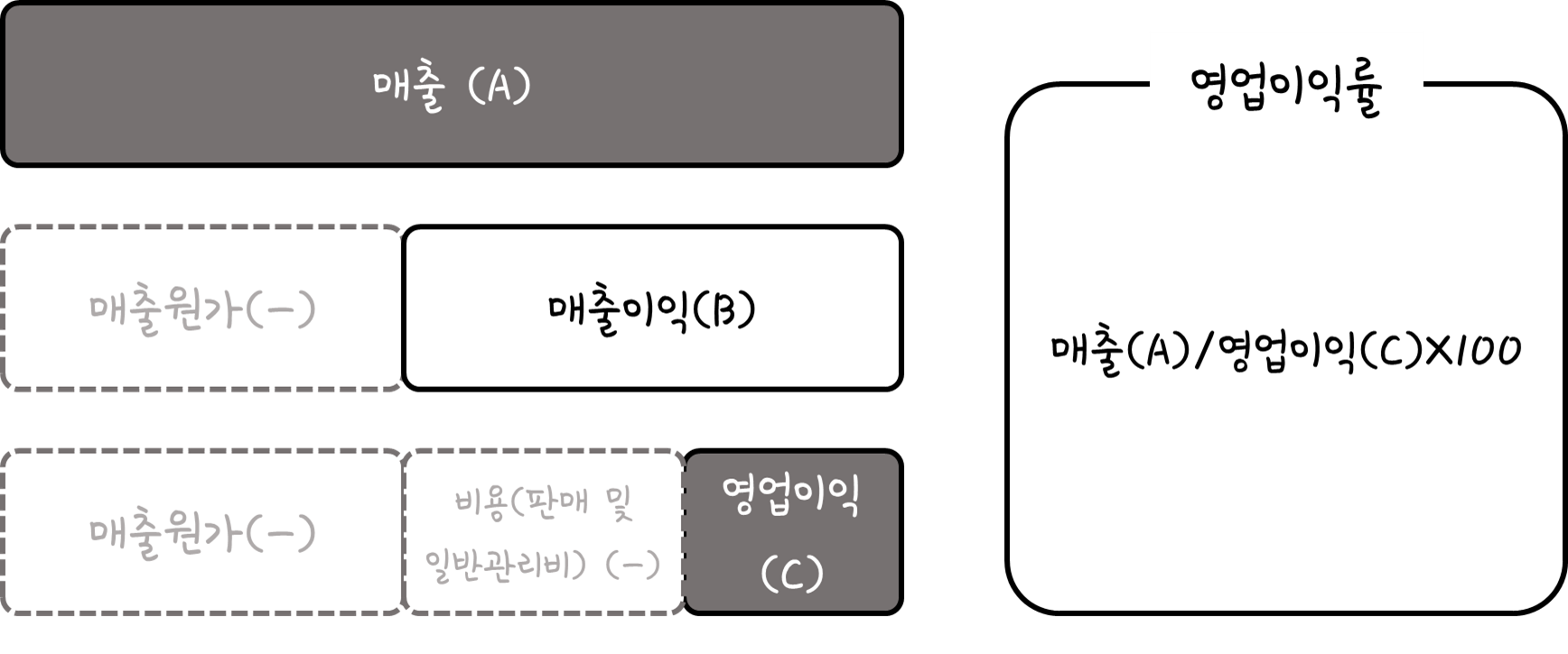 영업이익이란 매출에서 매출원가를 빼고(매출-매출원가=매출이익), 매출이익에서 각종 비용 (판매 및 관리를 위한 비용)을 뺀 수익을 말한다. 즉, 영업이익은 '매출이익 - 비용 = 영업이익'이 된다. 가장 쉽게 '사업(장사)해서 남은 돈이 얼마?'라는 개념이다. '판매한 금액(=매출)'에서 상품을 만들기 위해 들어간 비용인 '원가'를 빼면, 매출이익. 매출이익에서 해당 상품을 만들어 팔기 위해 들어간 인건비도 빼고, 알리기 위해 쓴 홍보비, 전기요금, 수도요금, 임대료, 각종 수수료, 감가상각비 등을 뺀 것이다.